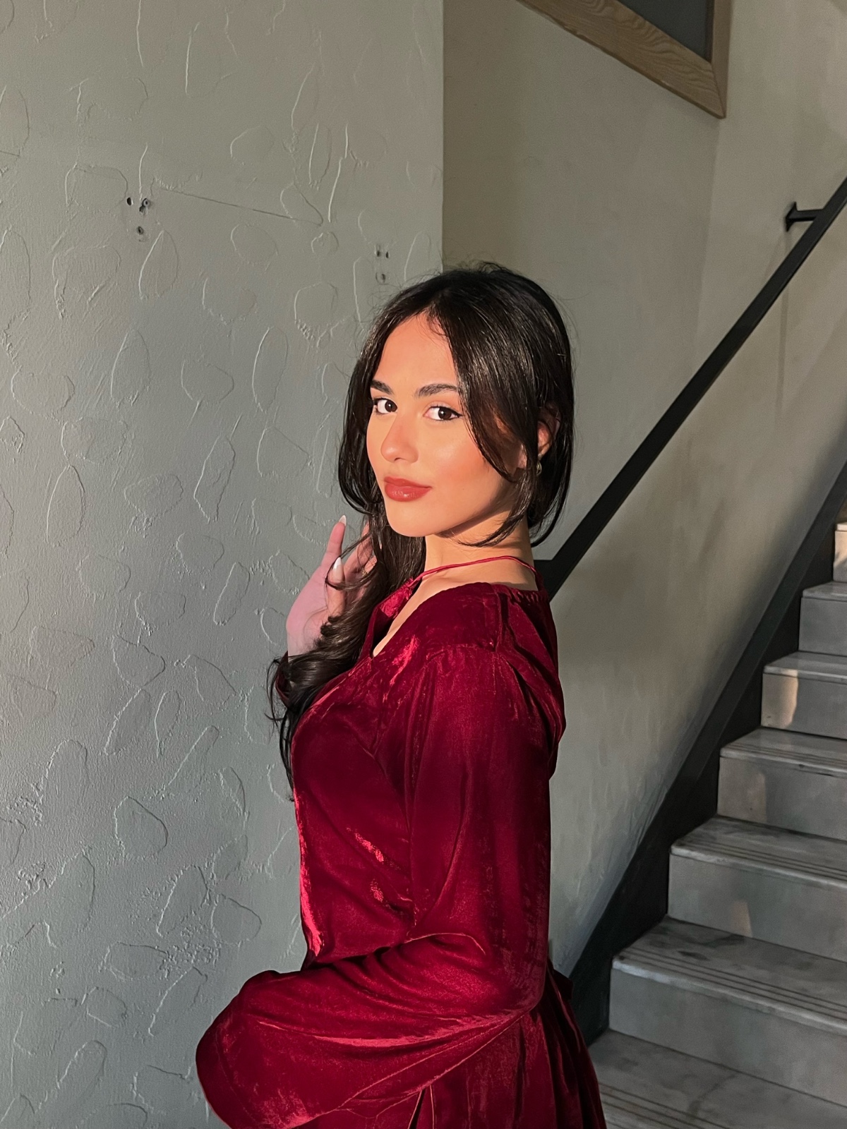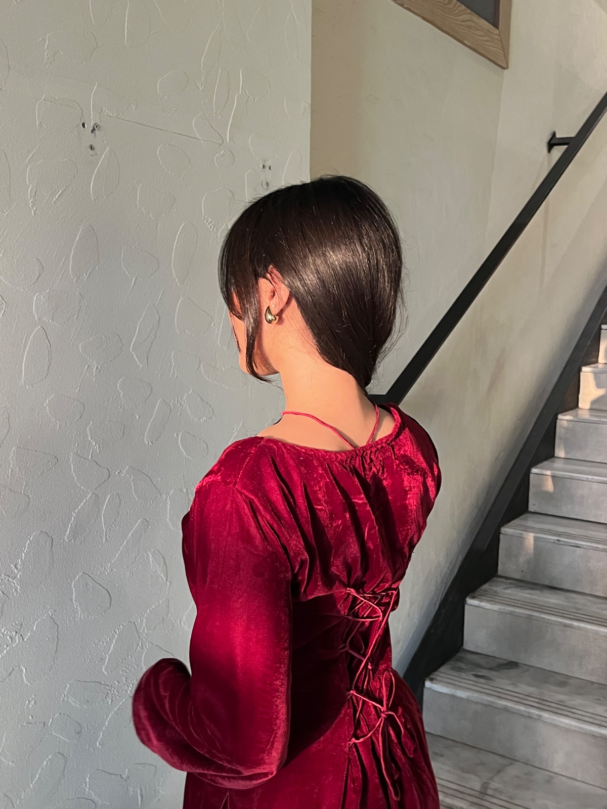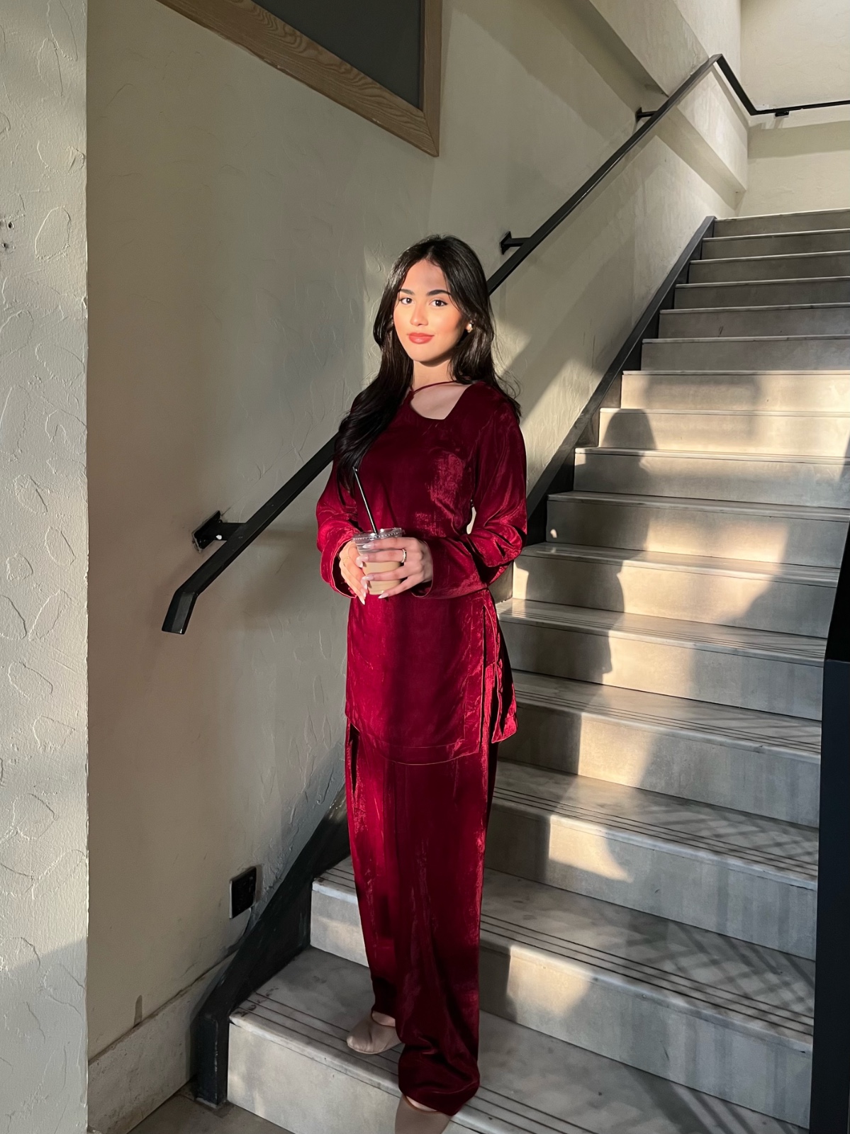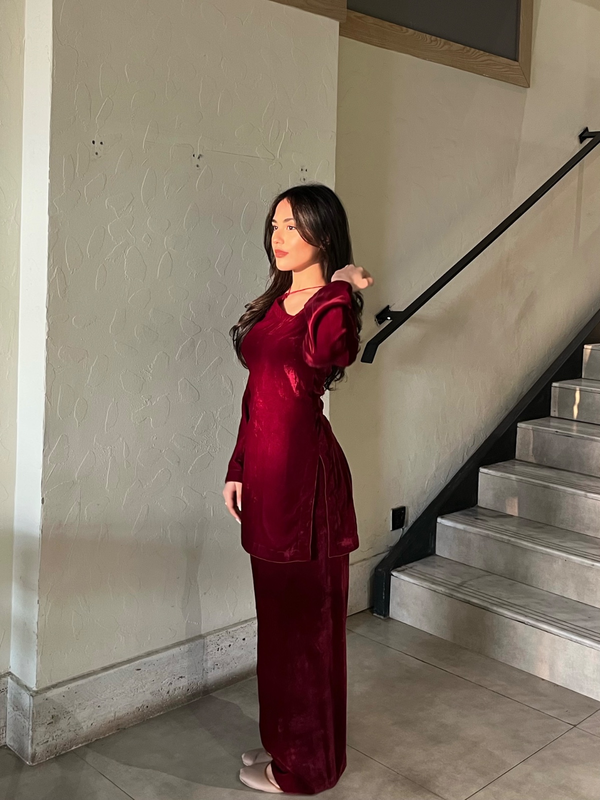A sophisticated traditional ensemble crafted from rich crimson velvet. It features a long-sleeved kurta with a simple, elegant neckline and matching relaxed farshi shalwar. The luxurious fabric suggests warmth and a refined aesthetic.