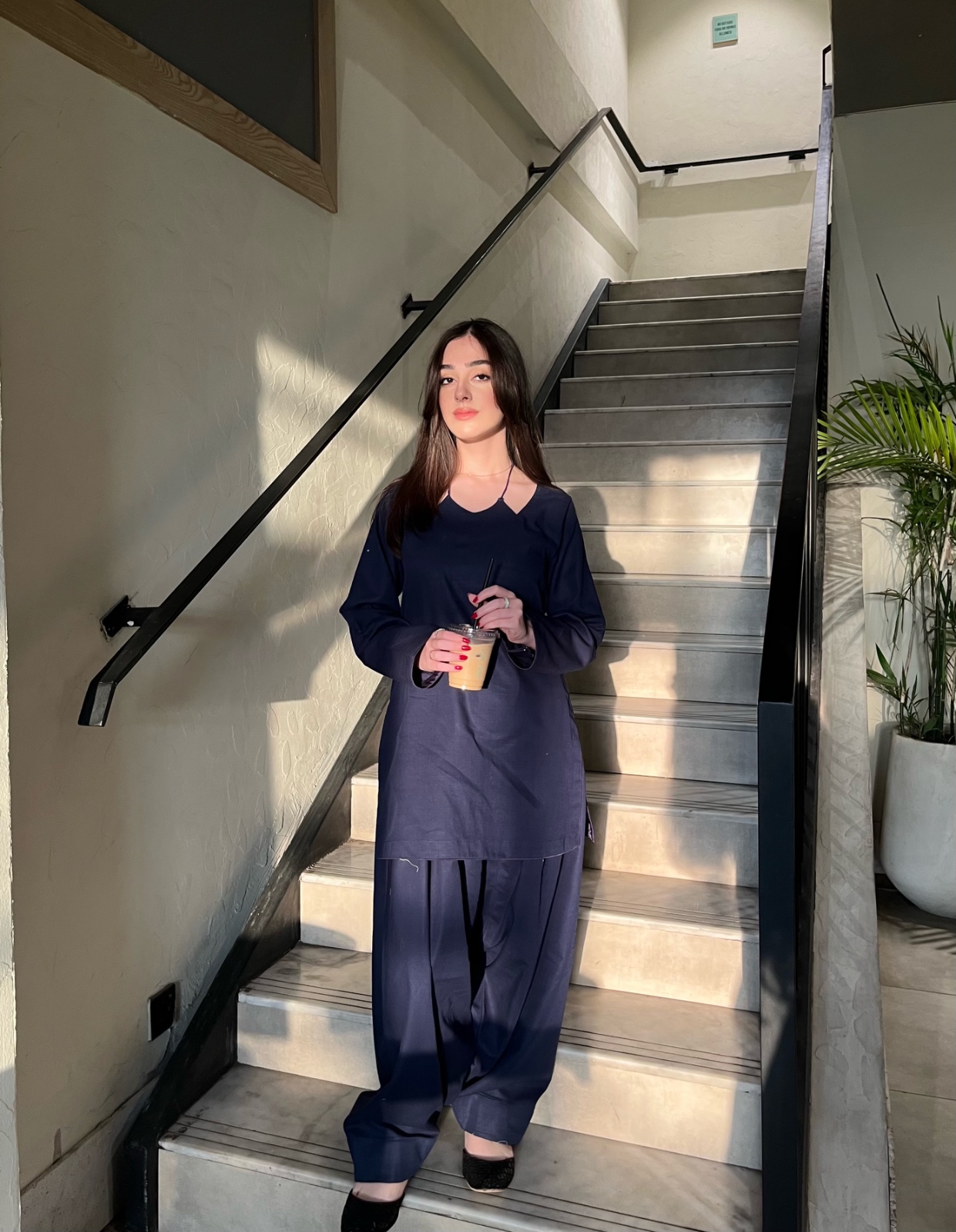 A classic and comfortable traditional outfit in a deep navy blue pure khaddar fabric.This ensemble includes a plain, long-sleeved (kurta) with a round neckline and loose-fitting, gathered trousers (farshi shalwar), presenting a modest yet stylish everyday look