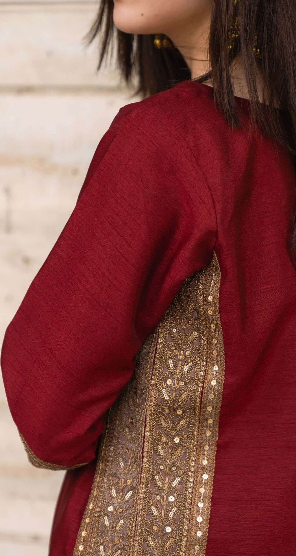 The deep maroon raw silk is luxurious and sophisticated. The natural irregularities of the silk add depth and character. Shimmering copper laces add a touch of sparkle and glamour.