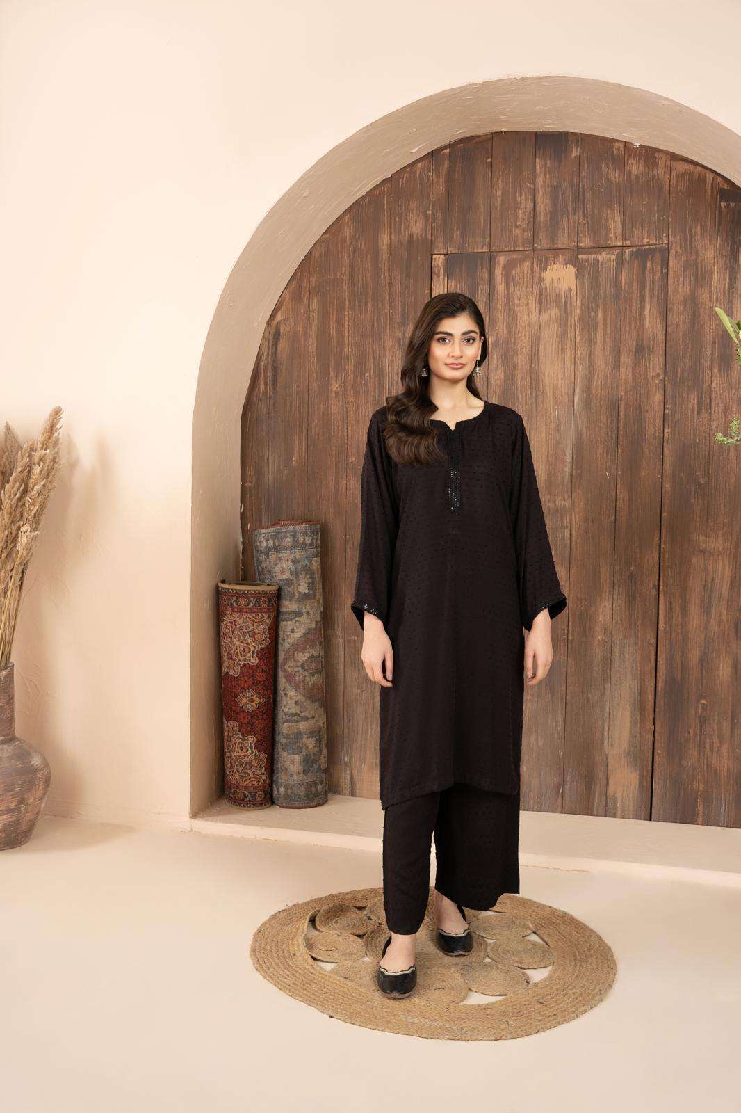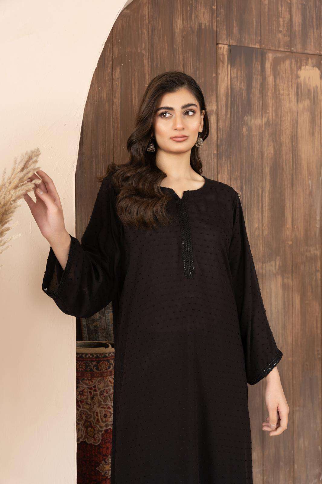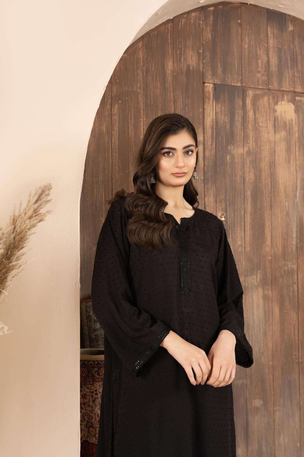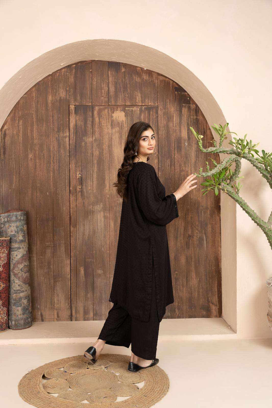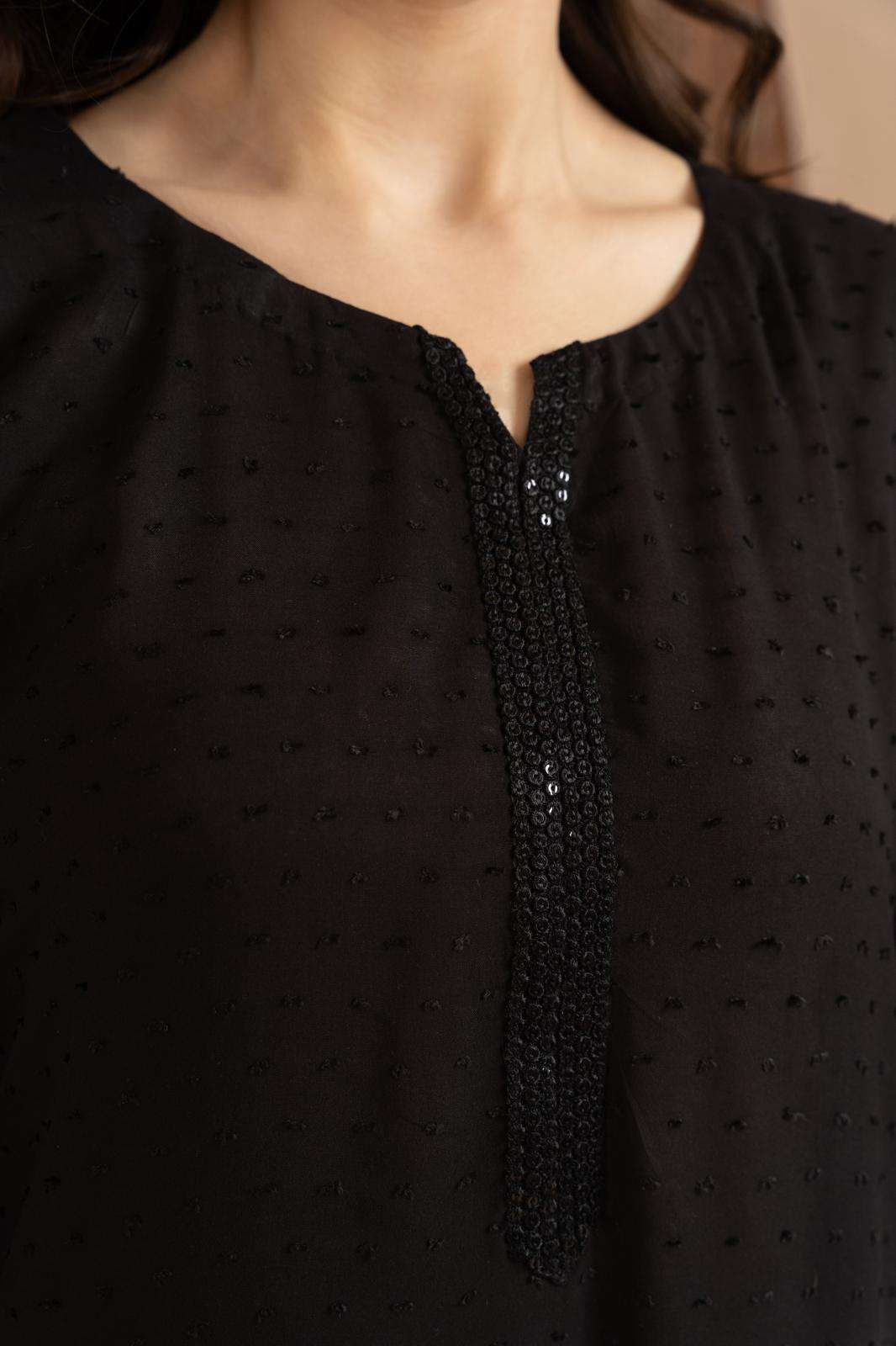 Noir is self print linen dress. Black in color. Long shirt is paired with trousers. The detailing on the neck making it look attractive and perfect for casual wear.